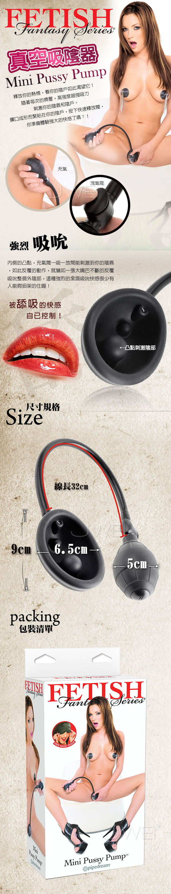 透明的橢圓形罩子,可以將整個外陰部完全覆蓋住,然後按押抽氣泵,將裡面的空氣吸出,然後再按押洩氣鈕,再將空氣吸出,如此反覆的動作,就猶如一張大嘴巴不斷的反覆吸吮整個外陰部,裡面還有個大凸點設計,就像真人的舌頭般可直接剌激陰蒂這最敏感的部位,這種強烈的全面吸吮快感很少有人能夠體會,因為沒有人的嘴巴可以張得這麼大,快感交錯從下體直達腦門,若是沒有什麼經驗的女性朋友可能沒兩下就潮吹噴水達到高潮境界了!