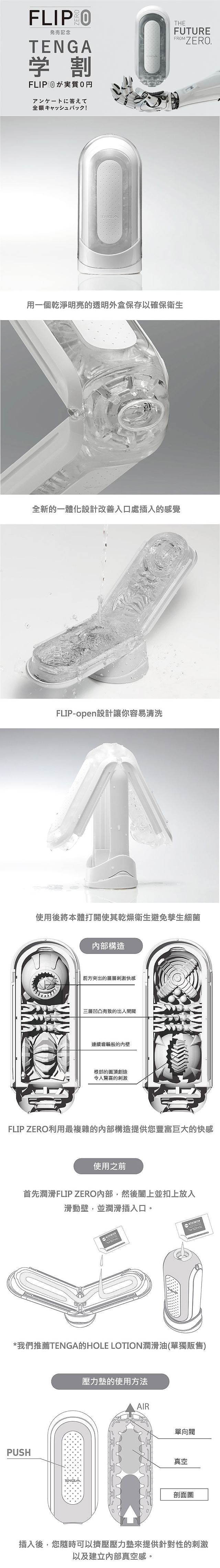 這是將人氣商品「TENGA フリップホール(TENGA FLIP HOLE)」系列徹底改良的十年大作,使用了最新技術及高密度的優質素材,展現「究極舒服並且容易使用」。改良後增強了密封效果,特殊結構設計防止潤滑液滲漏,如太空艙班可以上下開闔,讓清潔簡、便利。這些都是「FLIP ZERO」的賣點!