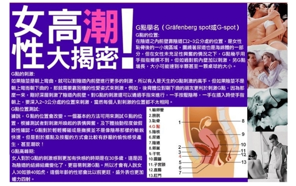 最新性學研究結果表明,女性有超過85%的為陰蒂高潮,即只需刺激外陰G點(陰蒂)即可得到高潮,女性身體上有多處敏感部位,其中以陰蒂和陰道前壁G點更為突出,G點位置在女性陰道前壁2-5公分處,本款玩具即使針對此點設計,在女性性反應時間上,撫摸陰部和刺激G點感受會更為強烈。