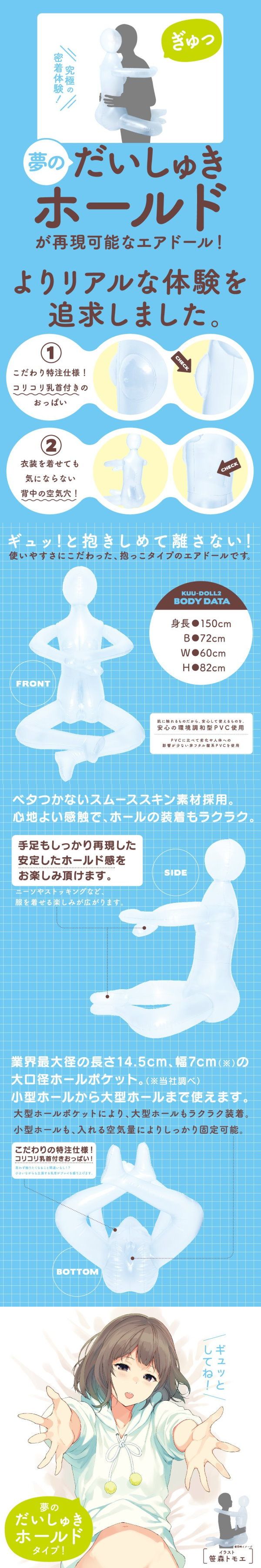 男たちの夢「だいしゅきホールド」が再現可能なエアドールが登場!!究極の密着体験が楽しめる「抱っこタイプ」、あなたをギュッと抱きしめて離しません。更に、よりリアルな体験を追求するため特注仕様の乳首パーツを搭載!プレイを更に盛り上げます。また、安心して使用頂けるように素材には肌にやさしい環境調和型のPVCを使用しており、サラサラの触感となっております。手足の先まで使いやすさにこだわりました。