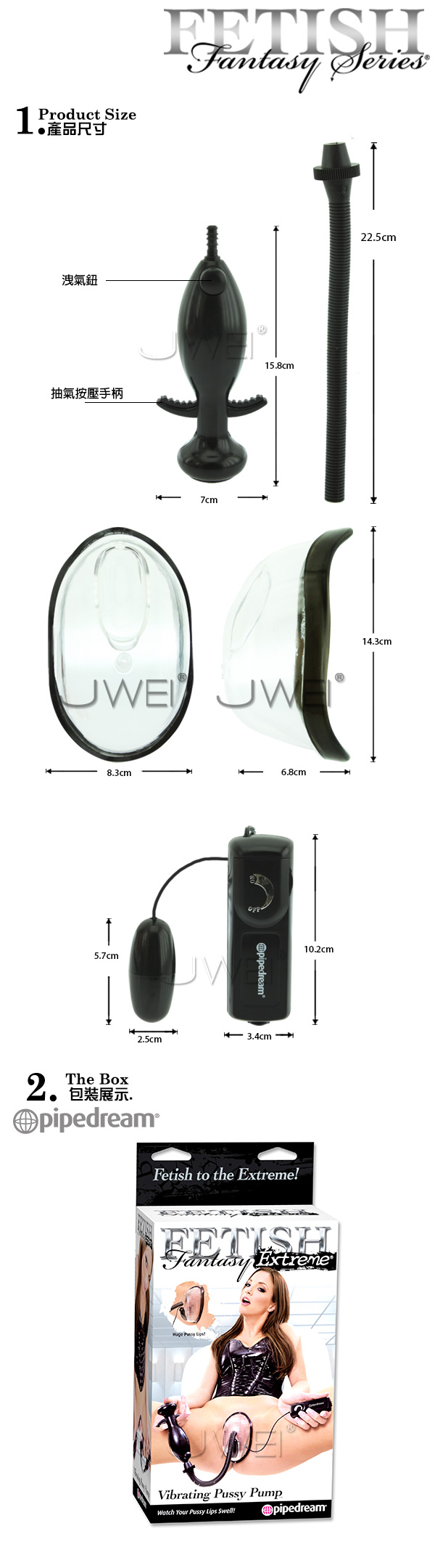 Fetish Fantasy Extreme - Vibrating Pussy Pump 極緻系列- 外陰真空吸吮震動潮吹器透明的橢圓形罩子,可以將整個外陰部完全覆蓋住,然後按押魚雷造型抽氣泵兩邊的手柄,將裡面的空氣吸出,然後再按押洩氣鈕,再將空氣吸出,如此反覆的動作,就猶如一張大嘴巴不斷的反覆吸吮整個外陰部,這種強烈的全面吸吮快感很少有人能夠體會,因為沒有人的嘴巴可以張得這麼大,而在罩子上面還設計一個凹槽可以把震動跳蛋置入,這時只要打開電源,那激震酥快感再加強烈吸吮快感交錯從下體直達腦門,若是沒有什麼經驗的女性朋友可能沒兩下就潮吹噴水達到高潮境界了!